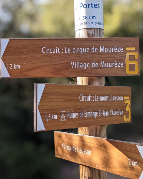 Le circuit se fait au départ de Liausson. Le stationnement y est beaucoup plus aisé qu’à Mourèze (payant 5€). Dans le village, côté Sud vous trouverez un parking, fléché avec le logo des randonneurs.