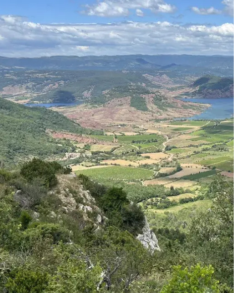 Au fil de la randonnée dans le Cirque de Mourèze, plusieurs panoramas permettent d’admirer toute la beauté de ce paysage dolomitique unique. L’un des plus impressionnants reste le belvédère du Mont Liausson, accessible par une montée un peu plus sportive. Depuis ce sommet, la vue s’ouvre largement sur le cirque, ses formations rocheuses étonnantes et le bleu intense du Lac du Salagou. Le contraste entre les reliefs clairs des rochers, la terre rouge du Salagou et l’eau du lac crée un panorama spectaculaire.