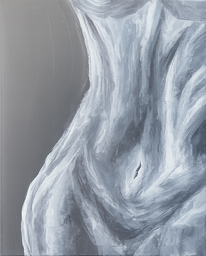 Dans une palette subtile de gris et de blancs, l’œuvre dévoile une silhouette suggérée, presque sculptée par la lumière. Les courbes fluides et les jeux d’ombres créent un effet de mouvement doux, comme si la matière respirait.